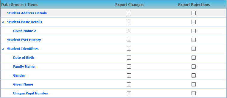 This only applies to Student Address Details, Student Basic Details (Given Name 2 only), Student FSM History and Student Identifiers. The default rule for all the data items for the Export Changes flags is deselected.