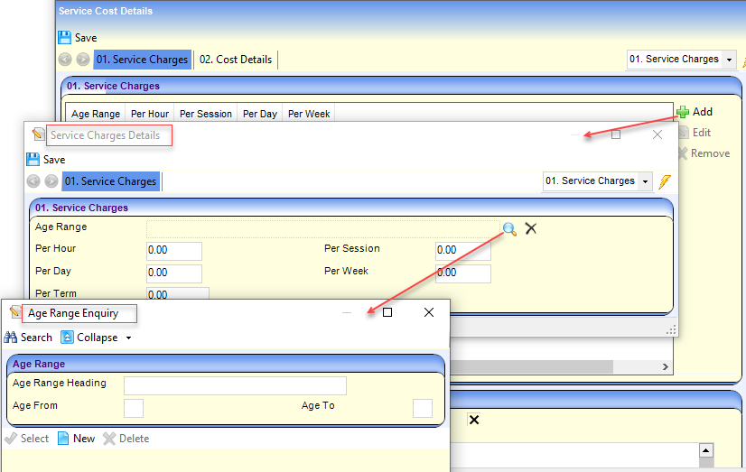Service charges for each age range and costs details for a service can be recorded, viewed or edited.