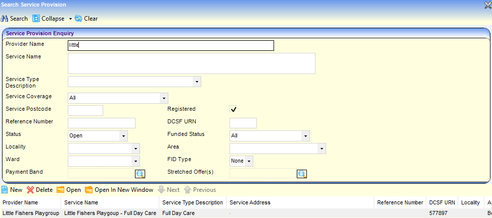 - Select the required service provision in the results list and click the Open In New Window button to display the Maintain Service Provision page.