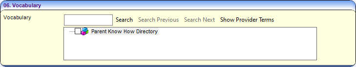 The Parent Know How Directory Vocabulary is a hierarchical list of terms provided by the DfE. The terms that are relevant to Early Years Providers are selected via Tools | FID | Vocabulary.