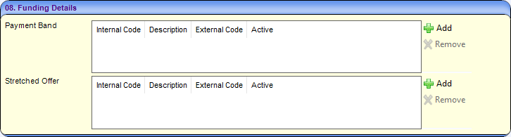 The Funding Details panel enables you to select one or more payment bands and stretched offers to associate with this service. These are used when defining the payment parameters for the service via Focus | Early Years | Early Years Setup | Payment Parameters.