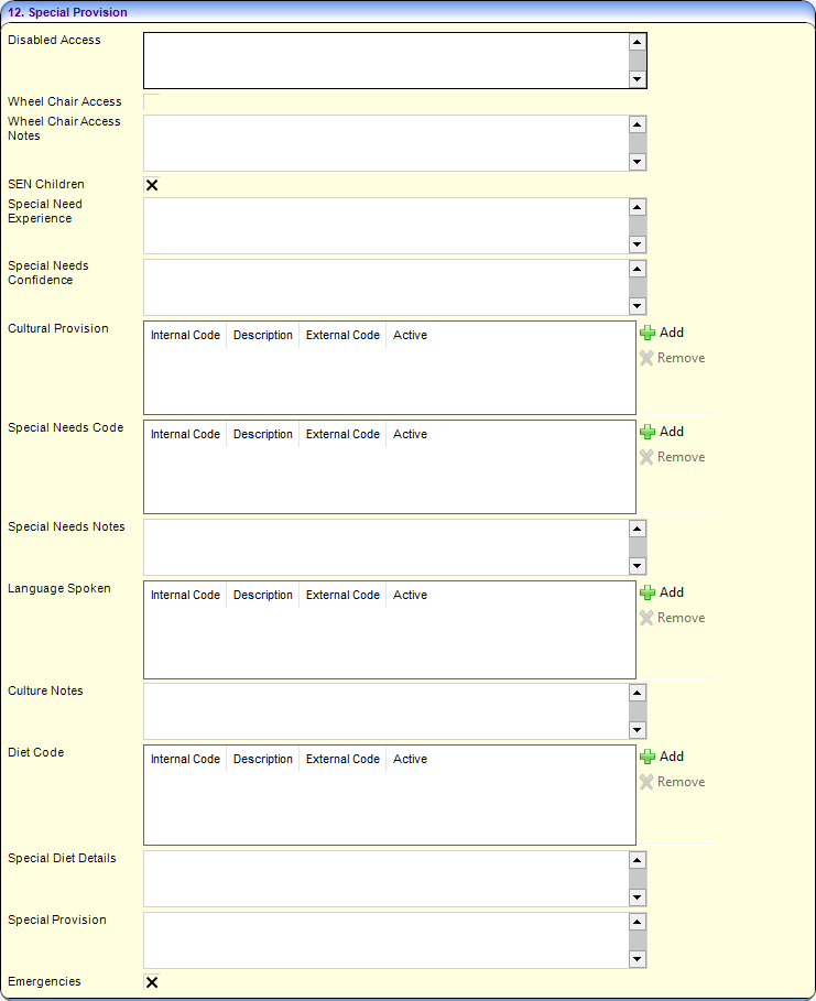 - If the service has provision for SEN children, select the SEN Children check box to display a tick. Special Need Experience and Special Needs Confidence can be entered as free text.