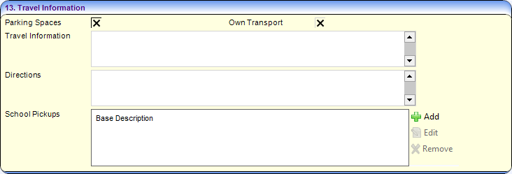 The Travel Information panel records information about parking and provision of transport at the service. If school pickups are available, the bases from where children can be collected and dropped off are recorded.