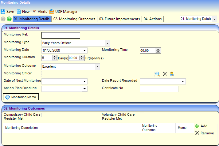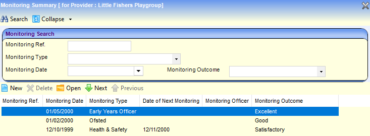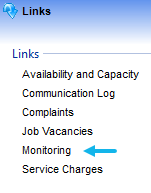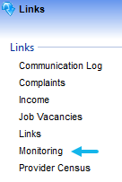 Monitoring information about a childcare provider can be displayed and updated. To display the monitoring, search for the provider or service and click the Monitoring link.