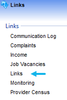 Links for a childcare provider can be displayed and updated. To display the links, search for the provider and click the Links link.