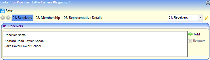 - Click the Links link to display the Links page with three panels: Receivers, Membership and Representative Details.