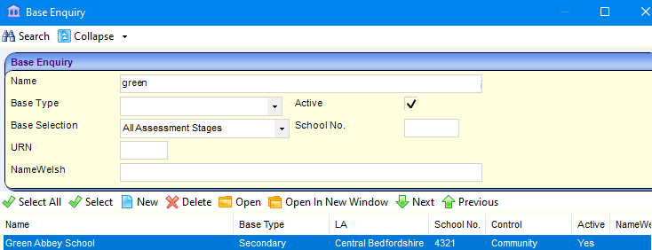 - Highlight the required base in the results list and click the Select button. Alternatively, click the New button to record a new base.
