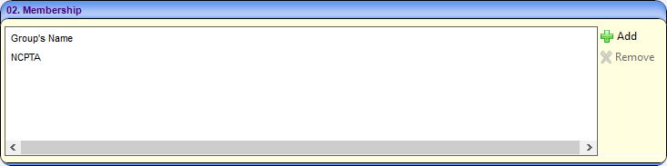 Membership of national groups are displayed on the Membership panel. A new membership can be added. To record a new membership: