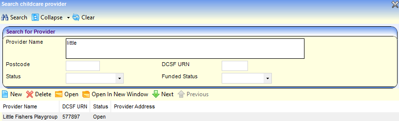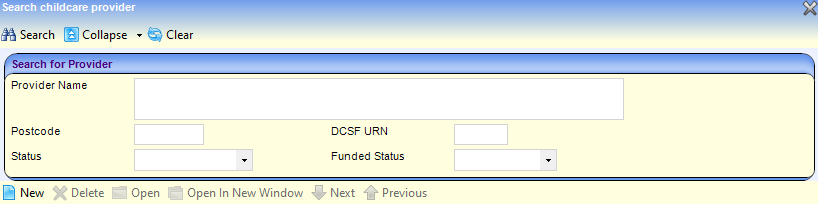 - Enter at least 2 characters of Provider Name, 3 characters of Postcode or 2 numbers of DCSF URN.