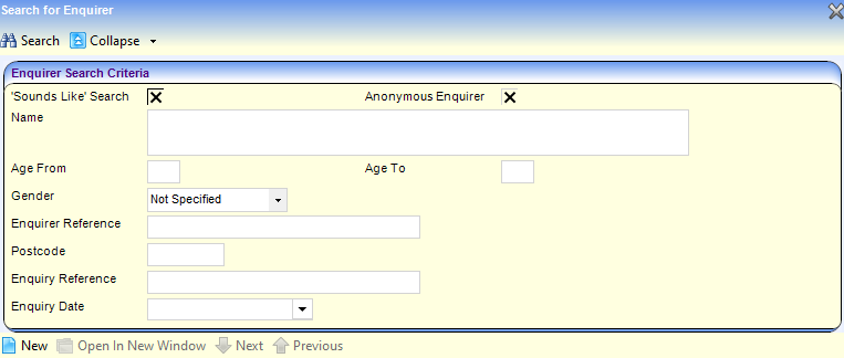 - To search for enquirers with similar names, select the Sounds Like Search button to display a tick.