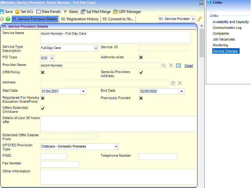 The dates and times when a service provision is available, the age ranges catered for, the capacity for specific age ranges and the vacancies at the service provision can be recorded.