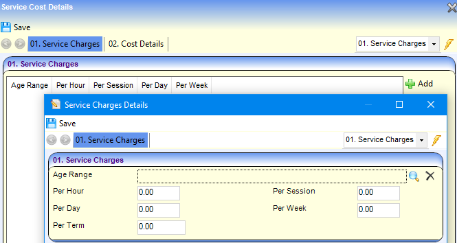 - Click the Add button on the Service Charges panel to display the Service Charges Details page.
