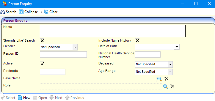 - From the Select drop-down, choose Select Person to display the Person Enquiry dialog.