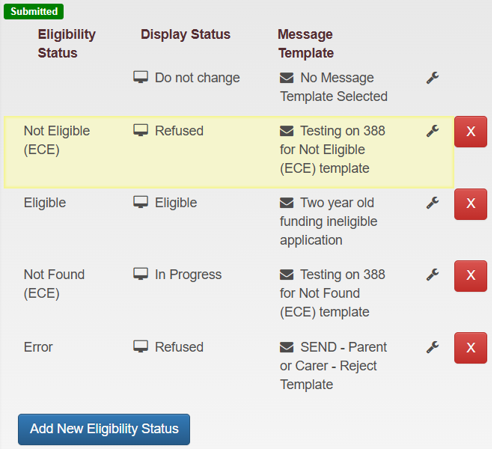 For applications that are Submitted, you can configure a status and a message template against each result of the DWP Eligibility Check. This configuration can be used to immediately inform the Citizen Self Service portal user the outcome of the eligibility check.Add a New Eligibility Status