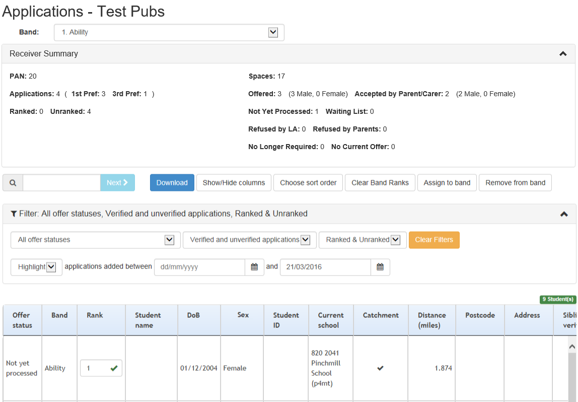 Own Admissions Authority (OAA) schools can use the School Admissions Portal to rank students and, if applicable, add or remove students from bands.