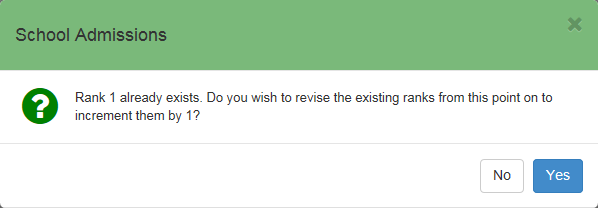 If you enter duplicate rank numbers, a dialog displays asking whether you wish to increment all subsequent ranks by 1. If you select No, you must enter a non-duplicate rank number for the affected student.