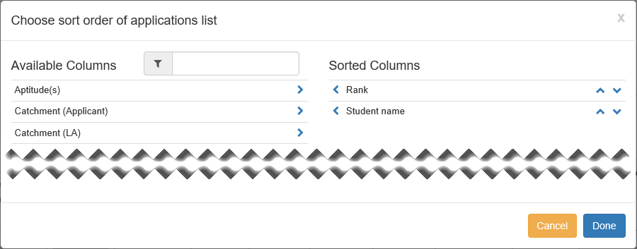 - Within the Available Columns list, select the column headings you wish to sort the applications by. Selected headings are moved to the Sorted Columns list.