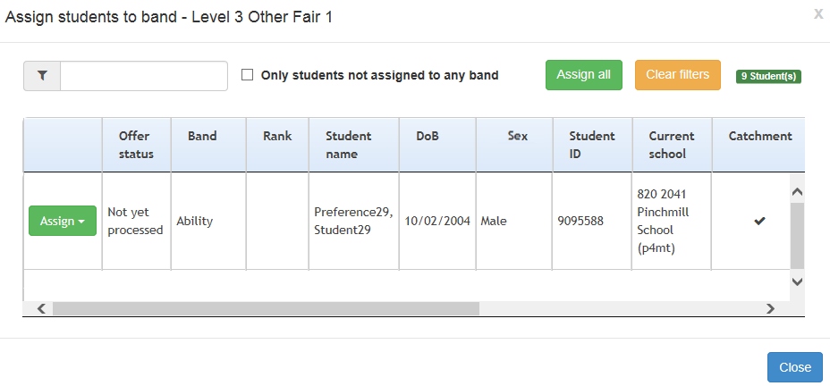 The Assign students to band dialog contains a list of students who meet all of the following criteria:- Already has a preference for the selected receiver, but is not assigned to the selected band.