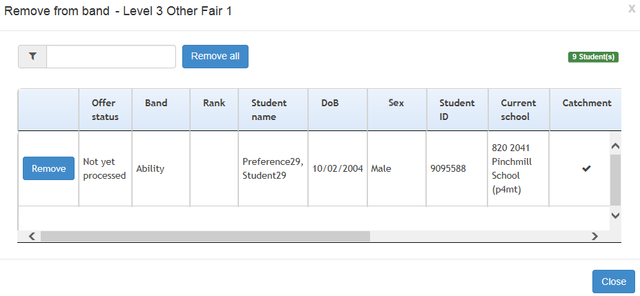 You can use the School Admissions Portal to remove students who meet all of the following criteria from a band: