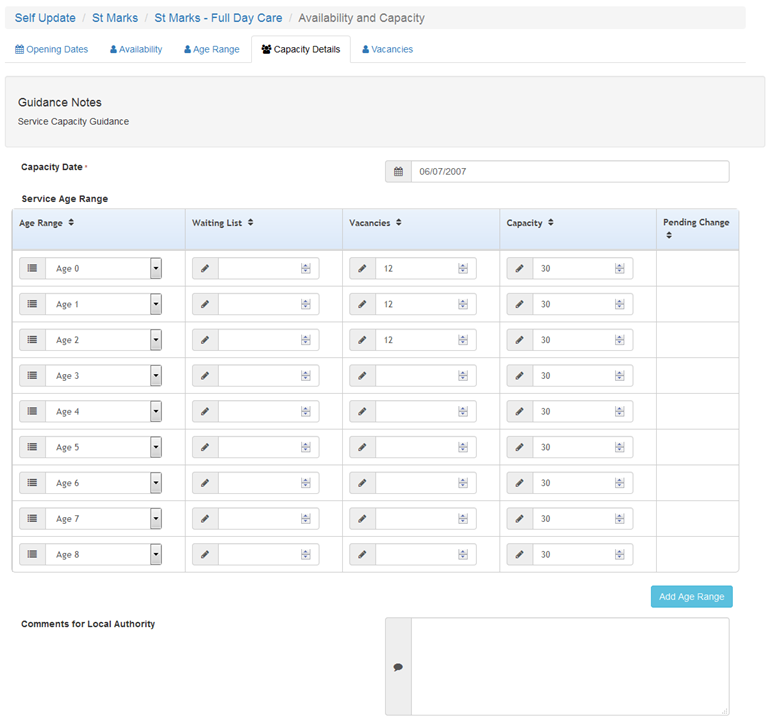 Information about when the service is available, the age ranges accepted, capacity, vacancies and waiting list can be updated by the provider.