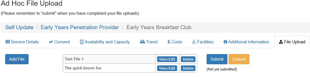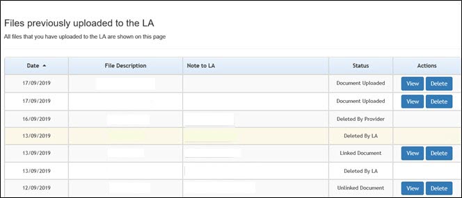 All files uploaded to the local authority are displayed in the Files previously uploaded to the LA screen. Providers can view and manage these files via List ad hoc files previously uploaded button on the Ad Hoc File Upload screen.