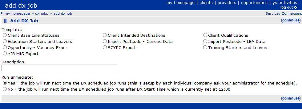 The DX job executes any import or export requests that have been entered in the IYSS web application through the DX Monitoring functionality (my homepage | IYSS Links | DX Monitoring). The DX job can be run throughout the day. When submitting new tasks to run as part of the DX job, users must determine whether that task is to be run with the next DX job, or with the first DX job after the time specified in the IYSS System Administration Client (System Values | DX Start Time).