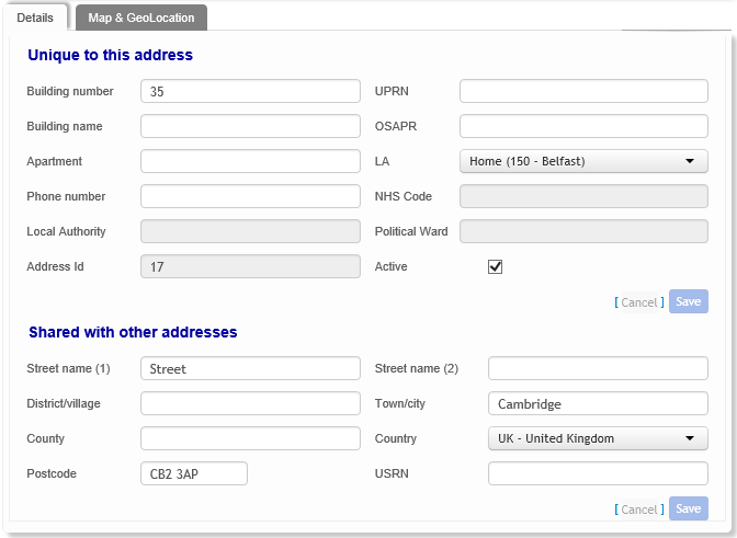 Details which are only relevant to the address in question, such as house name or number. - Shared With Other Address: