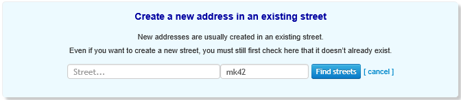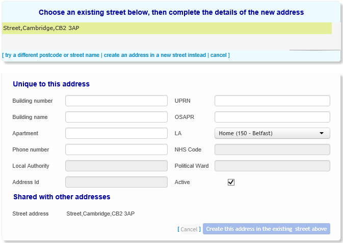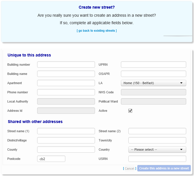 Enter details as required. - Click the Create this address in a new street button to create the address.