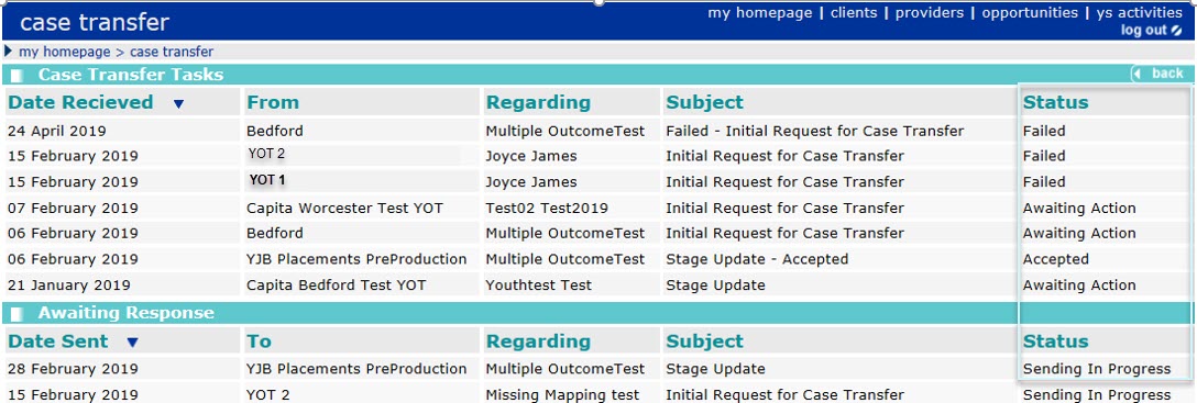 Youth Offending Teams can manage and monitor the status of both transferred and received cases as they progress. This allows for quick action to be taken if necessary, to continue/resume the transfer process.