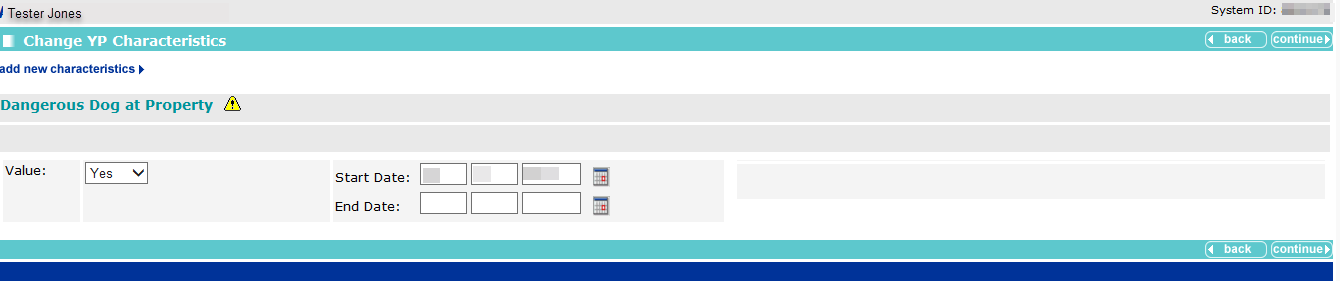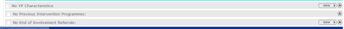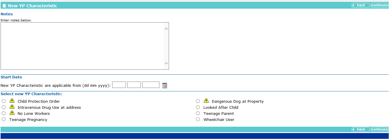 Characteristics are listed within the YP Characteristics panel. Until your client has any characteristics recorded, the panel header is grey and reads No YP Characteristics. If you require new characteristics creating to suit a particular case, contact your System Administrator. A yellow warning sign is displayed next to key characteristics. This produces an alert that is displayed at the top of the client record.