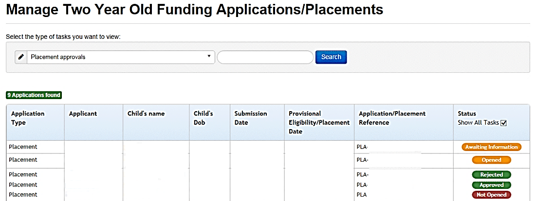 - On the Manage Two Year Old Funding Applications/Placements page, select the Show all Tasks check box.