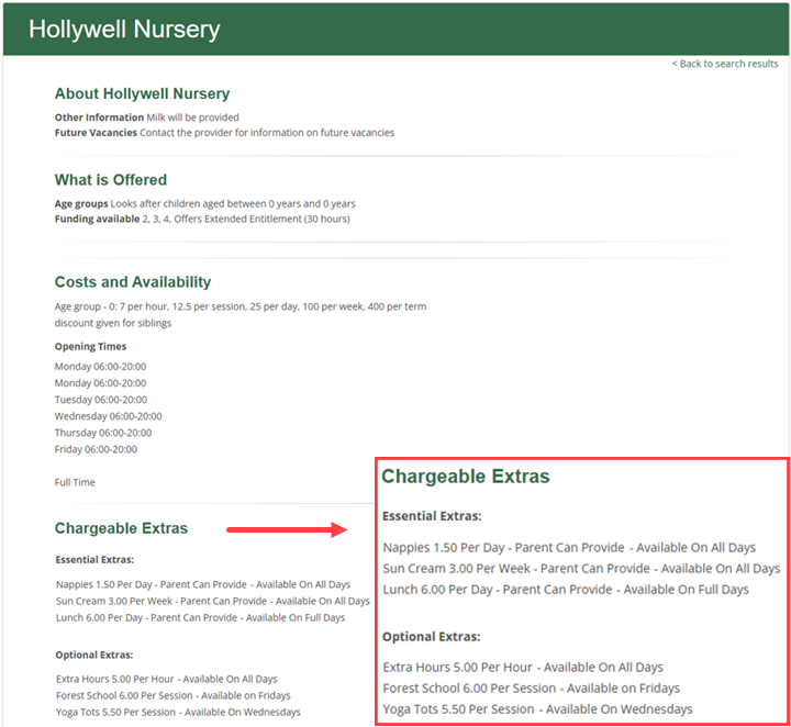 Parents using the FID website can see chargeable extras information for each provider in their profile section. From here they can easily understand the full costs of sending their child to that provider.