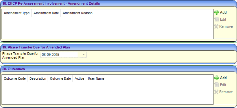 A new panel on Assessment Involvements has been introduced. This allows the Phase Transfer Due Date to be recorded on the assessment. It means Phase Transfer Reviews required many years in the future won’t need to be created.