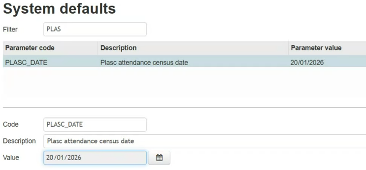 A new System default has been added for the PLASC Census Date. LAs can now update the census date as required. The date populates the <ReferenceDate> tag within the ATS and ATP files.